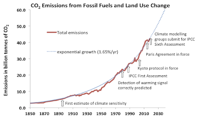1See figure. Emissions from Global Carbon Project until 2017 for energy and cement production plus land use change, 2018 using preliminary estimate by LeQuéré et al., Earth System Science Data, 10, 1-54, 2018, DOI: 10.5194/essd-10-2141-2018. 2018 land use emissions assumed unchanged against previous year.