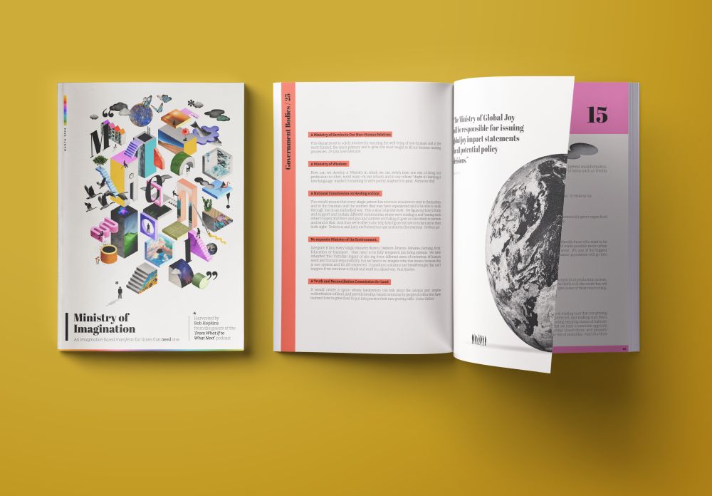 This year, perhaps now more than ever, we need a taste of what policymaking underpinned by the radical imagination looks like. Recognising how extraordinary and powerful this collection of possibility-infused policies from an eclectic mix of people from all around the world (including Brian Eno, Rutger Bregman and Kate Raworth – ecologists, renegade economists, artists, prison abolitionists, somatic trauma therapists, printmakers, politicians, disability activists, rewilding practitioners, and so many more) I felt it was important to collect them all in one accessible place. And so ‘The Ministry of Imagination Manifesto: an imagination-based manifesto for times that need one’ was born. We’ve painstakingly edited together all the policies, under subject headings, and the whole thing has been beautifully designed by Capella Andrean of The Creative Bloc.