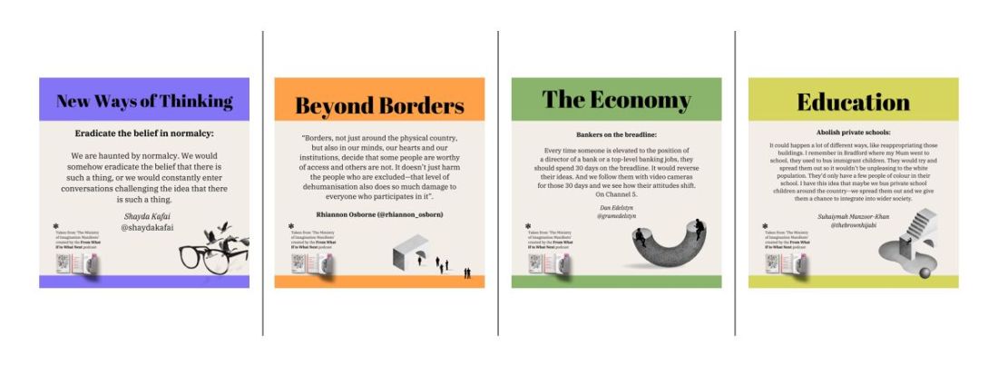 Alongside the main episodes, Patreon subscribers also received bonus Ministry of Imagination podcasts, in which they were inaugurated as Ministers at the Ministry itself (part-Hundertwasser, part-Hogwarts, part-Yellow Submarine) and invited to choose 3 policies each that would rapidly accelerate our transition to a world in which those changes had happened. The result was over 600 deeply thoughtful, considered, audacious and ambitious policies covering everything from free art materials for all, to a Universal Basic Income and every company having to list all their failures as well as their successes in their annual reports.