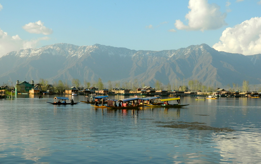 ‘Shikaras’ on Srinagar’s Dal Lake, with the nearer peaks of the Himalayan range behind.