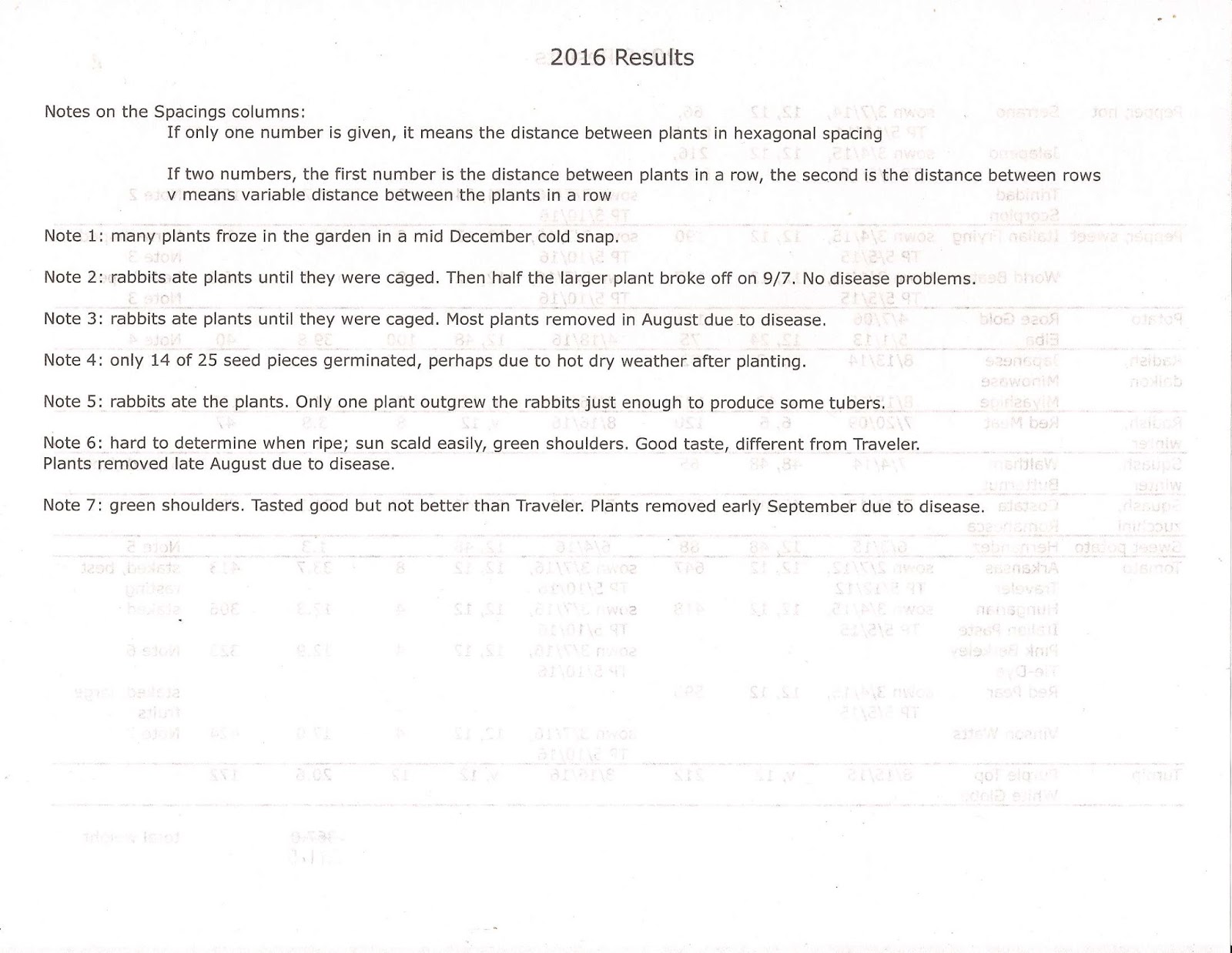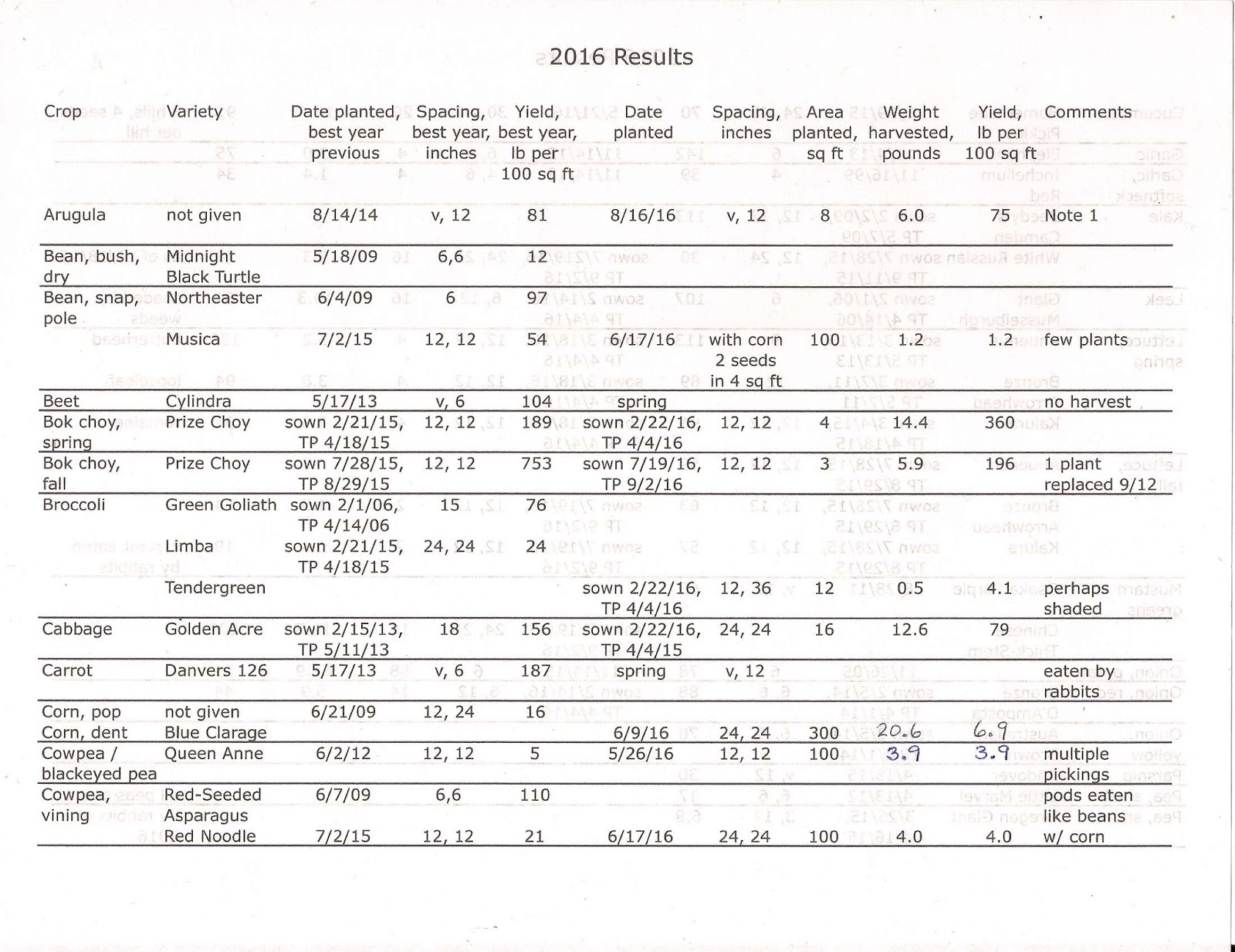 The four figures at the bottom of this post show the results I obtained for most of the crops that I grew in 2016 in comparison to the best yield I have obtained in the past for that crop. The five leftmost columns give the particulars for the year in which I obtained the best yield, while the six rightmost columns give the information for 2016.