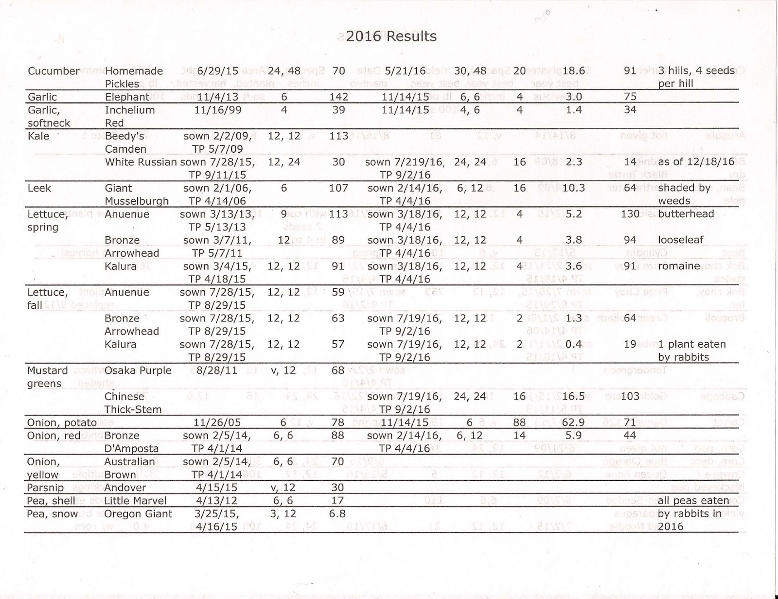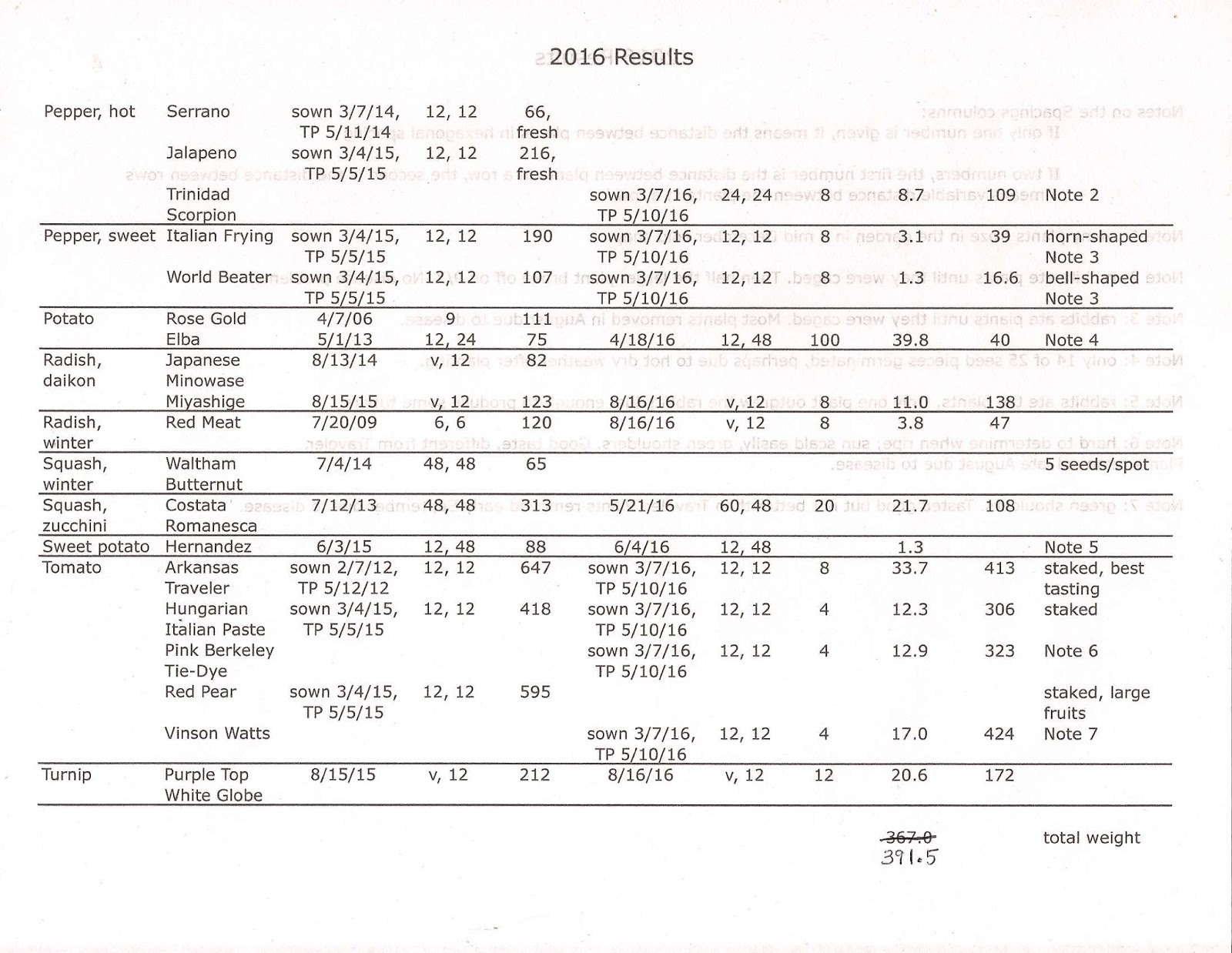 Fall-planted cabbage family crops, leaves and roots: as I predicted, yields of all of these, except mustard greens and daikon radish, were lower in 2016 than the best past year. For kale, another factor besides the heat was larger spacing between plants in 2016 compared to 2015.