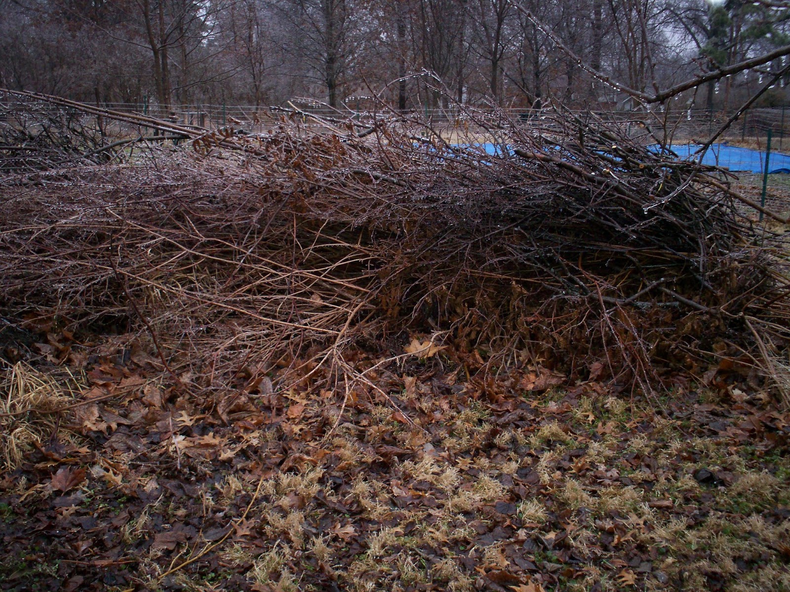 The pile of prunings on an icy winter day. Just beyond is the garden. The blue tarp is smothering grass where new garden beds will be dug in 2017.