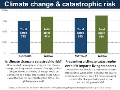 Yet people understand climate risks, even as political leaders wilfully underplay or ignore them. 84% of 8000 people in eight countries recently surveyed for the Global Challenges Foundation consider climate change a “global catastrophic risk”. The figure for Australia was 75%. The GCF report found that many people now see climate change as a bigger threat than other concerns such as epidemics, population growth, weapons of mass destruction and the rise of artificial intelligence threats. GCF vice-president Mats Andersson says “there’s certainly a huge gap between what people expect from politicians and what politicians are doing”.