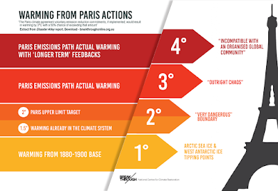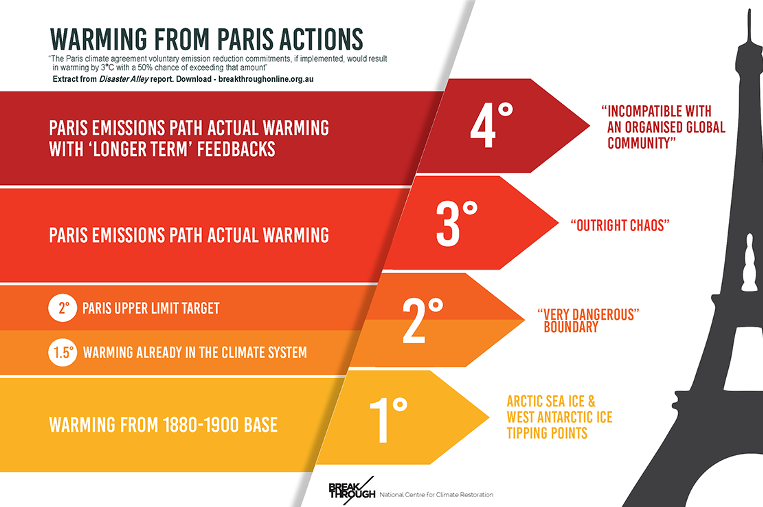 Yet this is the world we are now entering. The Paris climate agreement voluntary emission reduction commitments, if implemented, would result in the planet warming by 3°C, with a 50% chance of exceeding that amount.