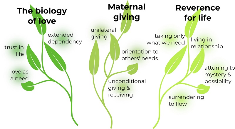 The biology of love is restored. Humanity is functioning as one interconnected whole. We meet our material and non-material needs as members of a global interspecies web through maternal gifting in regenerative communities and in reverence for life.