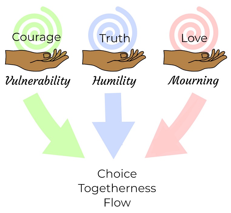 Mourning supports love. Embracing it makes it possible to face the gap between our beloved vision and present reality without numbness or rage, and thus deepens choice. Mourning with others brings us together with others in remembering what we love. Accepting and mourning what exists regenerates our energy as we surrender to life’s flow.