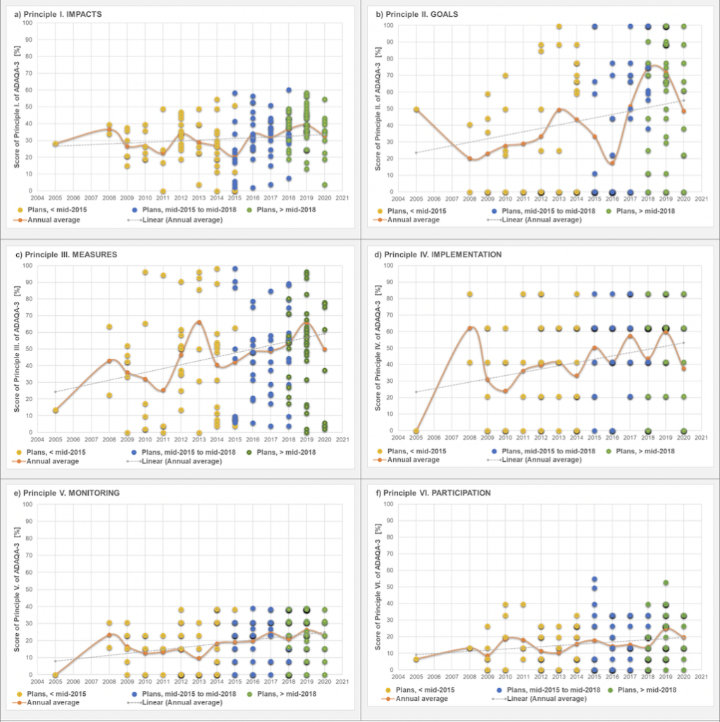 Based on a combination of these six principles and various consistency measures, we develop a new “ADAptation plan Quality Assessment” (ADAQA) index. We then apply it to urban adaptation plans in a sample of 327 European cities that were published between 2005 and 2020.