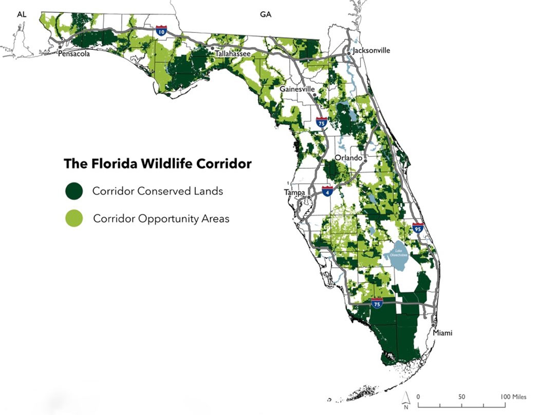 The area slated for protection spans from the Everglades to the Florida Panhandle, or fully one-third of the state. In the fall of 2023, a partnership of the Florida Environmental Protection Agency, the Department of Defense, and Conservation Florida succeeded in permanently protecting a 2,526 acre parcel as part of the corridor. In June 2024, the State of Florida completed a further $41-million acquisition of 1,800 acres along the main tributary for Lake Okeechobee.