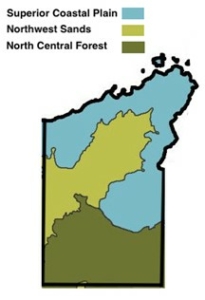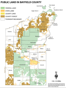 Public land held by county, state and federal agencies (left) and the ecological landscapes of Bayfield County (right). All of Bayfield’s ecological landscapes are within the Northwoods Country.