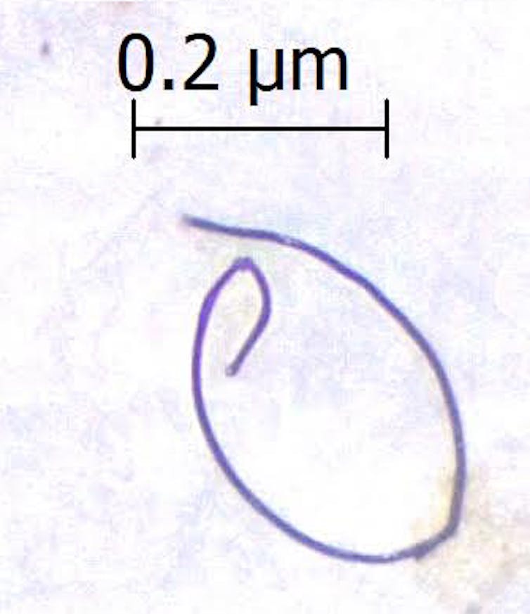 A plastic microfiber found in the exhaled breath of a bottlenose dolphin is nearly 14 times smaller than a strand of hair and can be seen only with a microscope. Miranda Dziobak/College of Charleston, CC BY-SA