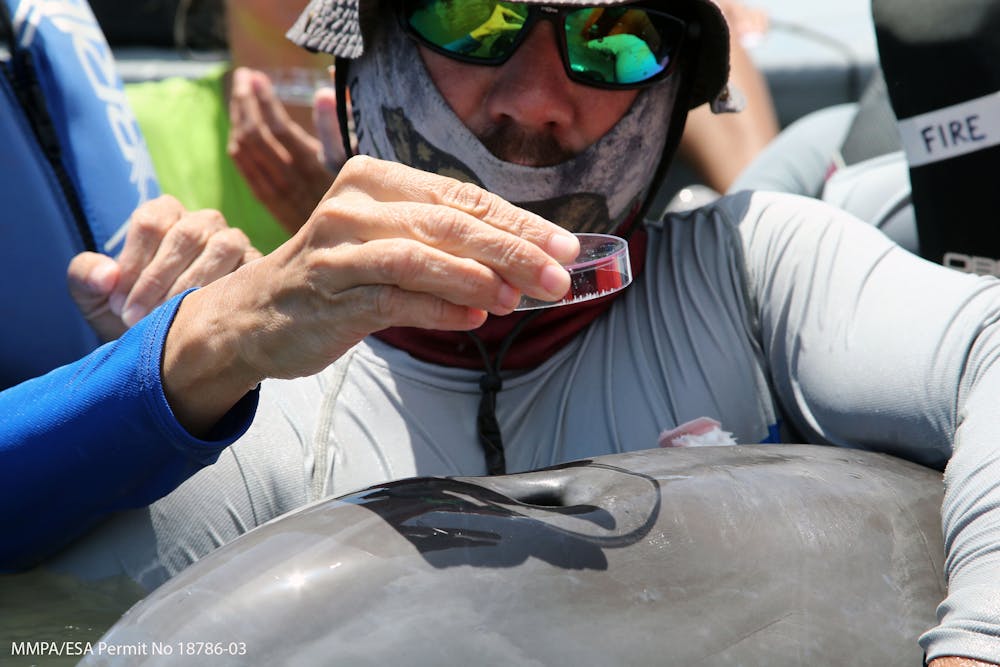 Exhaled breath is collected from a dolphin during a wild dolphin health assessment in Barataria Bay in Louisiana. Todd Speakman/National Marine Mammal Foundation, CC BY-SA