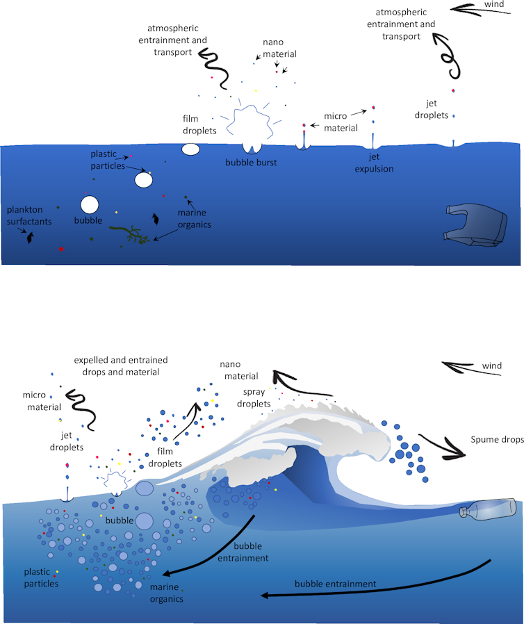 The ocean releases microplastics into the air through surface froth and wave action. Once the particles are released, wind can transport them to other locations. Steve Allen, CC BY-SA