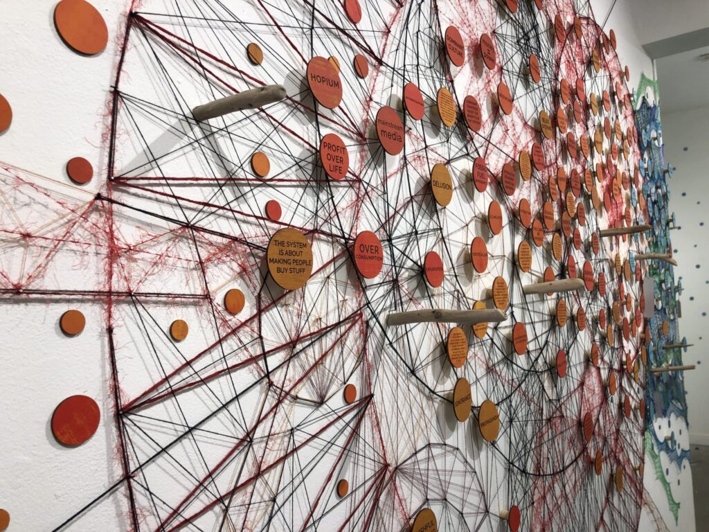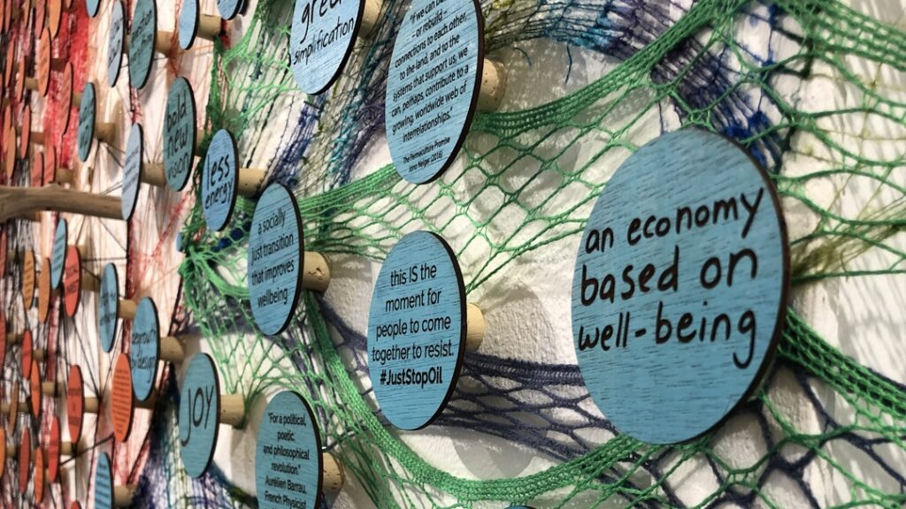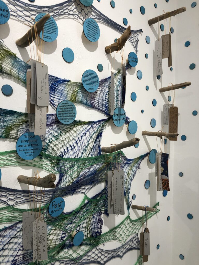 When the opportunity came my way for a new gallery exhibition, I seized the moment to embark on a large participatory installation project, “Down to Earth,” inspired by the 50th anniversary of Limits to Growth. Exhibited at two California galleries, the installation created a visualization of societal responses to our polycrisis and invited the public to provide input by writing and hanging their own thoughts and concerns directly on the installation. Subsequently, I worked on another project commissioned by the Post Carbon Institute for their report cover, Welcome to the Great Unravelling: Navigating the Polycrisis of Environmental and Social Breakdown, to create another visualization based on the climate stripes.