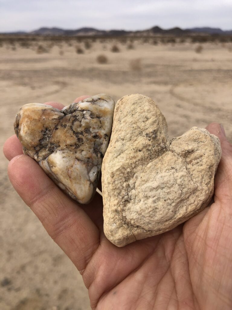 Two heart-shaped rocks found during my last artist residency in the Mojave Desert in January 2023.