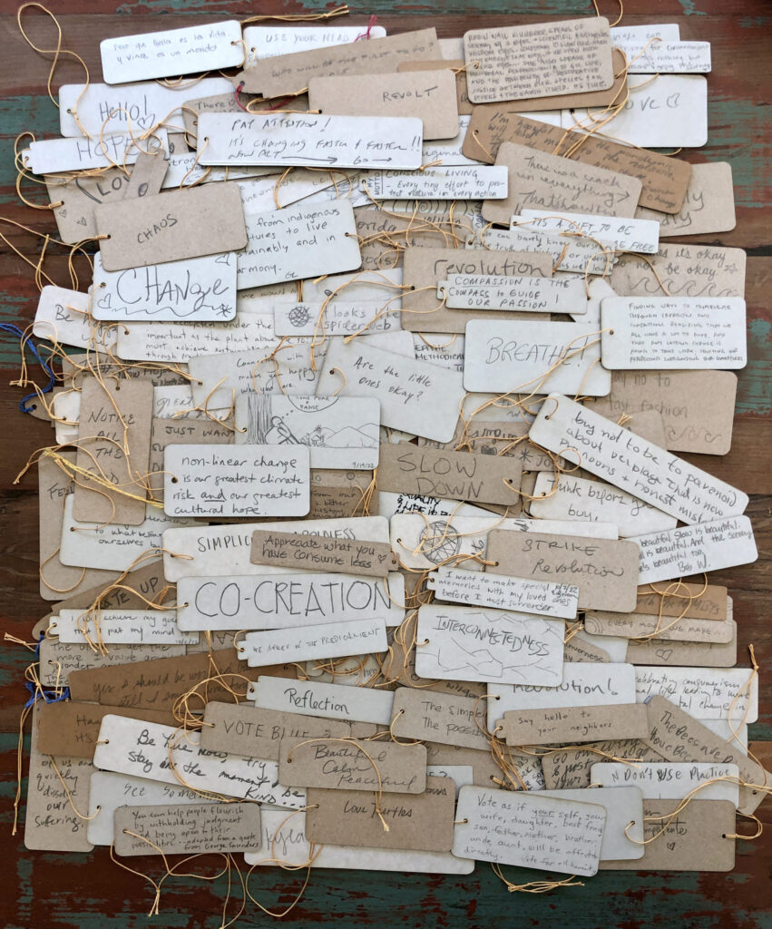 Despite my sleepless nights, the knowledge gained through my constant quest for understanding and the connections formed with organizations like MAHB, Post Carbon Institute, and Deep Transformation Network have been invaluable to me. Taking action, engaging the community, and instigating projects like “What’s Next for Earth” have made me feel more connected and helped me to foster new and lasting friendships with people who share my concerns. Through participatory installations, I’ve sought to amplify awareness about our predicament and encourage reflection on possible actions. And the journey and anxiety have led Kyle and me to a pivotal decision to create Authentique Artfarm with a focus on resilience and being more connected to nature in our daily lives.