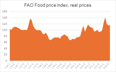 There is also the possibility that climate change starts to hurt food production. That is certainly a likely outcome in the future, but I am not yet convinced that this is already the case, at least not on a scale that influences global food production and food prices. Most qualified research on the topic discuss future risks and scenarios rather than today’s situation. But even a modest increase of freak weather event can have massive impacts on food prices. As the example of the EU shows, policies to combat climate change might have as high impact on food production as climate change itself. I don’t say that because I think it is wrong to make policies to combat climate change, but I believe it is essential to be clear that those policies, mostly, come with a price tag, which in the short term actually can be quite high as well as painful for those bearing the brunt of the policies, be it farmers or consumers.