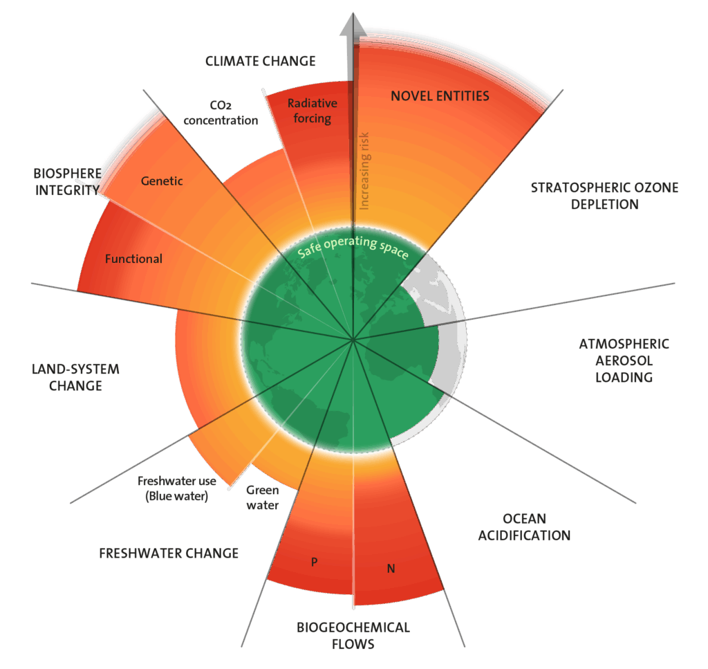 The 2023 update to the Planetary boundaries. Licensed under CC BY-NC-ND 3.0. Credit: “Azote for Stockholm Resilience Centre, based on analysis in Richardson et al 2023”.