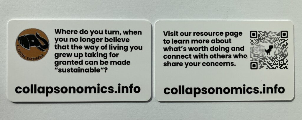 Each Black Elephant pin comes with a small laminated card with the Collapsonomics.info web address and a QR code that links to the site. The card is small enough to carry in your wallet or purse, sturdy enough to last, and it should mean that, if a conversation has gone off the deep end, you can leave someone with some starting points for where to go next.