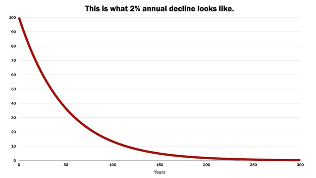 The fact that both human sperm count and insect biomass are estimated to be declining at about 2 percent per year may be just a numerical coincidence. Nevertheless, it’s a number that should grab our attention. It may help to visualize what such a decline looks like over time: