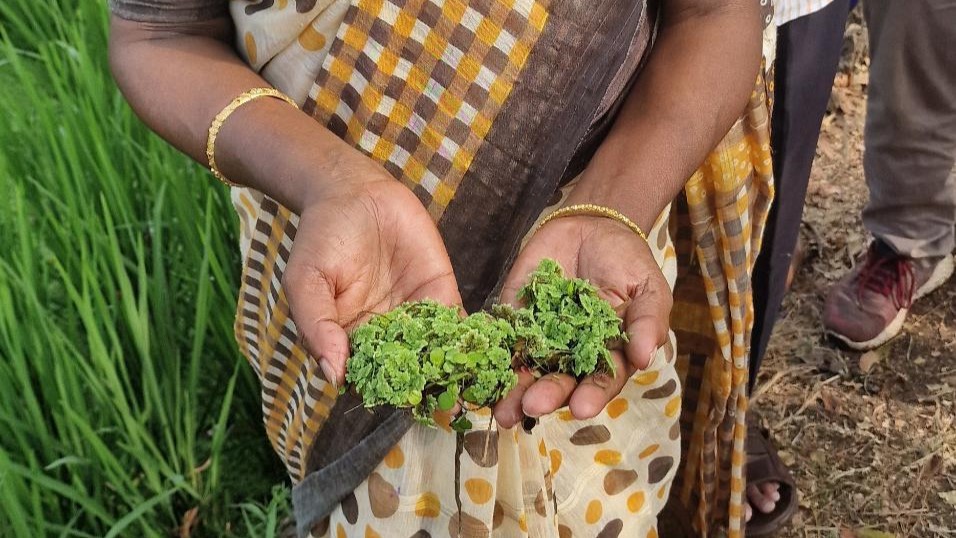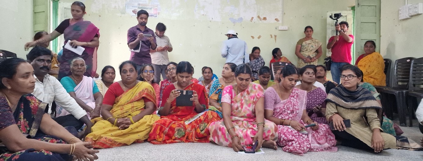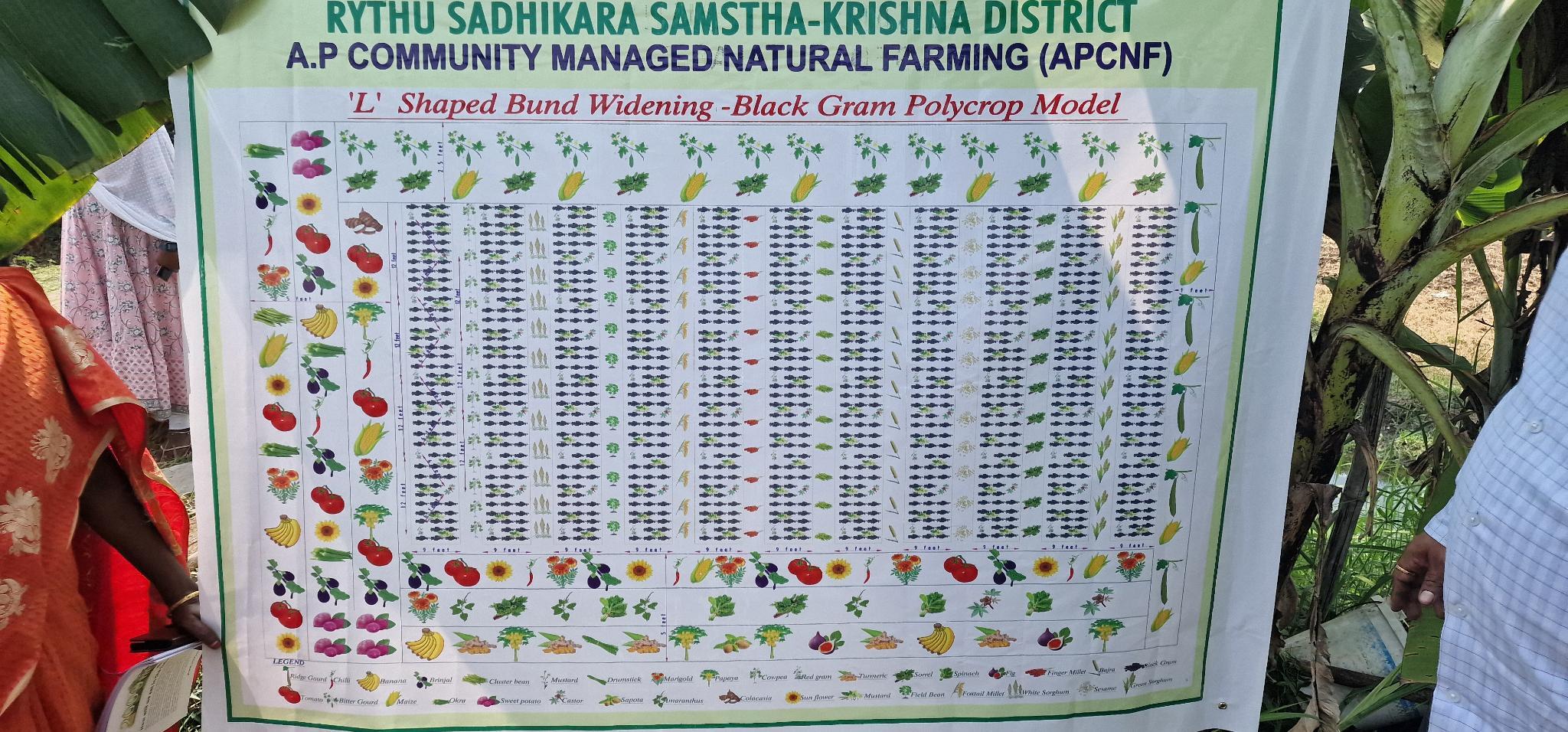 She has written “climate resilience” on the poster made of wrapping paper that the neighbour is now holding up, while Sowjanya talks about how, thanks to Natural Farming, the root balls have a wider and deeper base and the soil fertility has increased significantly in the first year thanks to PMDS.