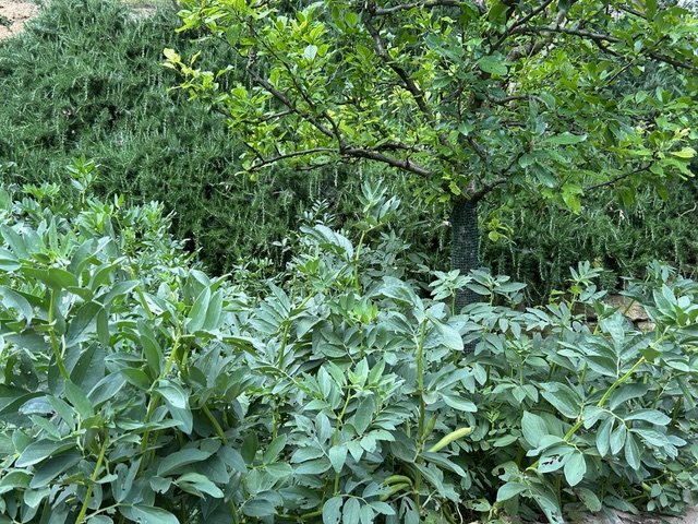 Fava beans under a plum tree, the hillside behind is planted with rosemary