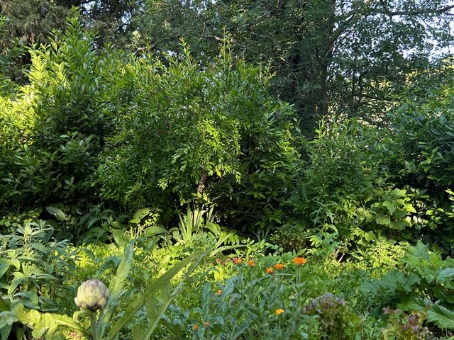 Sage, artichoke, calendula, comfrey, currant bushes, a small pomegranate tree, with laurels and a cypress behind. Salad greens and edible weeds cover the ground.