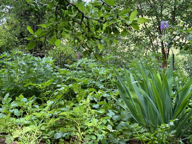 Iris and potato plants in front with motherwort behind and a plum tree above