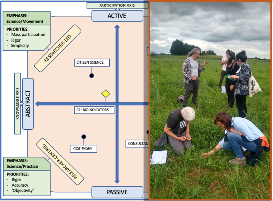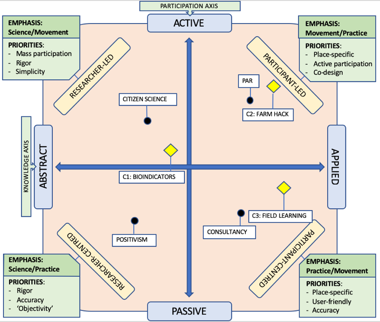 We used this as a basic set of coordinates to start mapping the three case studies of knowledge co-production, to understand how each project had evolved to fit specific needs and contexts of its participants. For instance, the Farm Hack project, led by a group of farmers wanting to develop tools and skills to meet their particular needs, was positioned top right, due to its focus on applied knowledge and active participation. Contrastingly, the bioindicators project was further to the left as it dealt with more abstract knowledge (i.e. surveying methods and generalised botanical knowledge), while still involving somewhat active participation of those that commissioned and shaped the study.