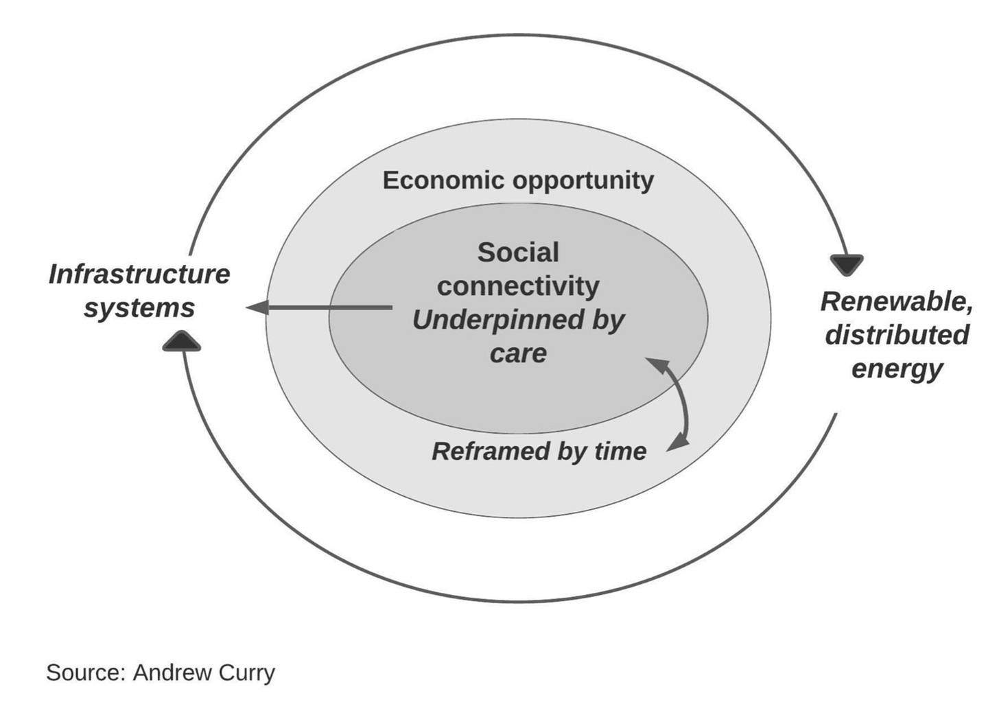 In all of this, the ecological city is a hygiene factor. A meaningful politics of the future will need to deal with the psychological crisis. So it might also involve a different politics of time—and we’re already seeing this in the innovations around the four day week. And it will need a different politics of care, and we’re not close to that yet. My suggestion here is that a politics of the future that might make a difference would be about reimagining our relationships, with each other and with nature.