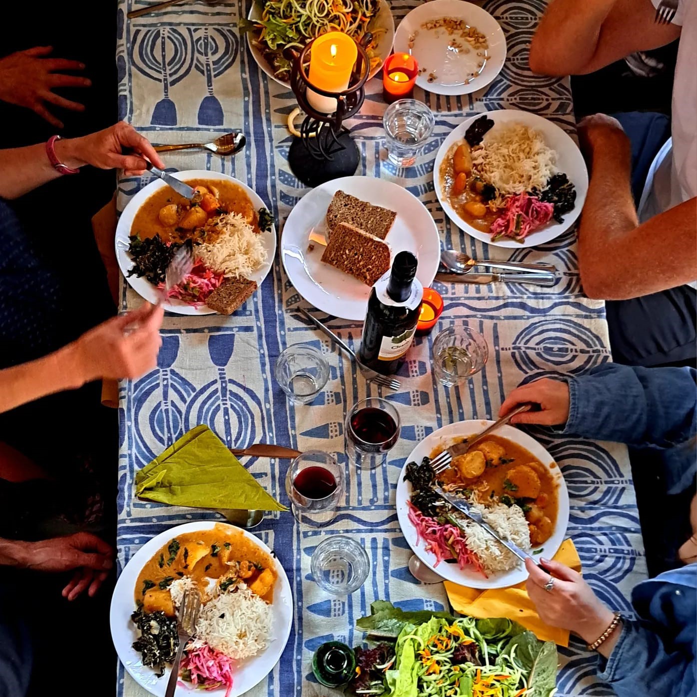 Eats and Beats is an event the farm hosts in a large room that we rent in the community enterprise centre on site in the ecovillage. Here, local cooks work from the farm’s surplus to create a meal for whoever books the event. After eating comes the dancing.