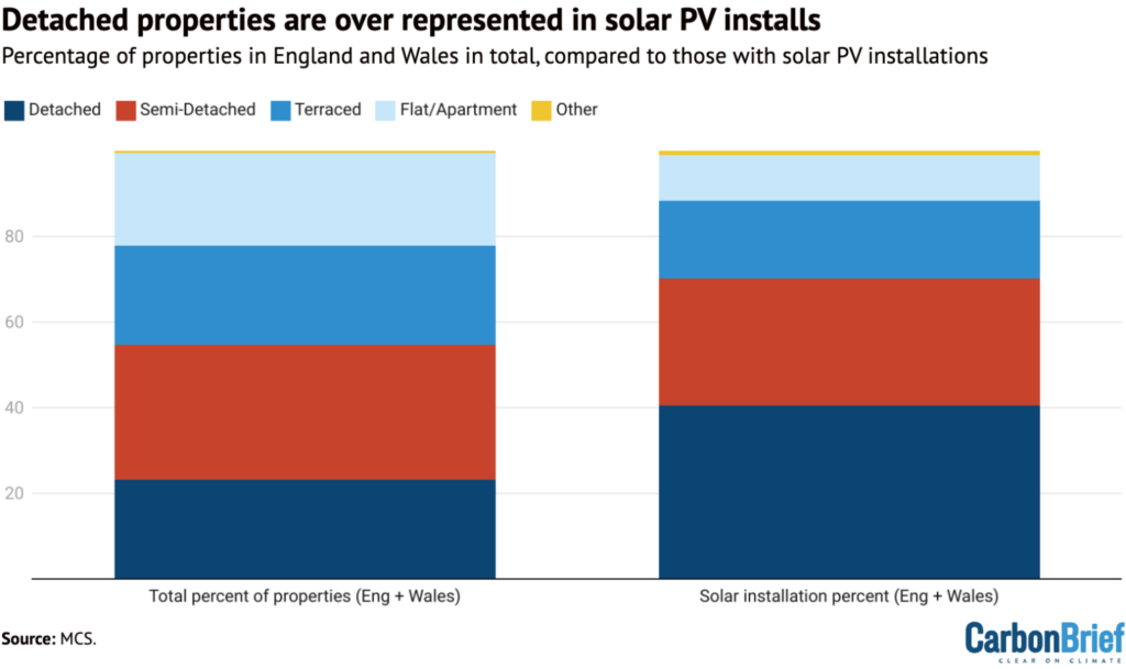 This means detached properties – which tend to be larger, with more roof area – are over-represented in terms of their share of solar installations, as shown in the figure below.