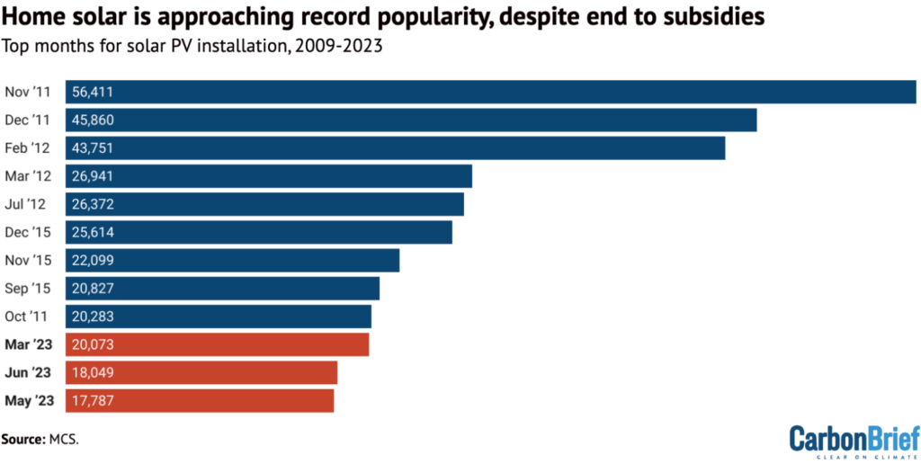 The top 12 highest months for solar PV installation in the UK between 2009 and 2023, according to the MCS Dashboard, with the three months in 2023 shown in red. Source: MCS. Chart: Molly Lempriere for Carbon Brief.