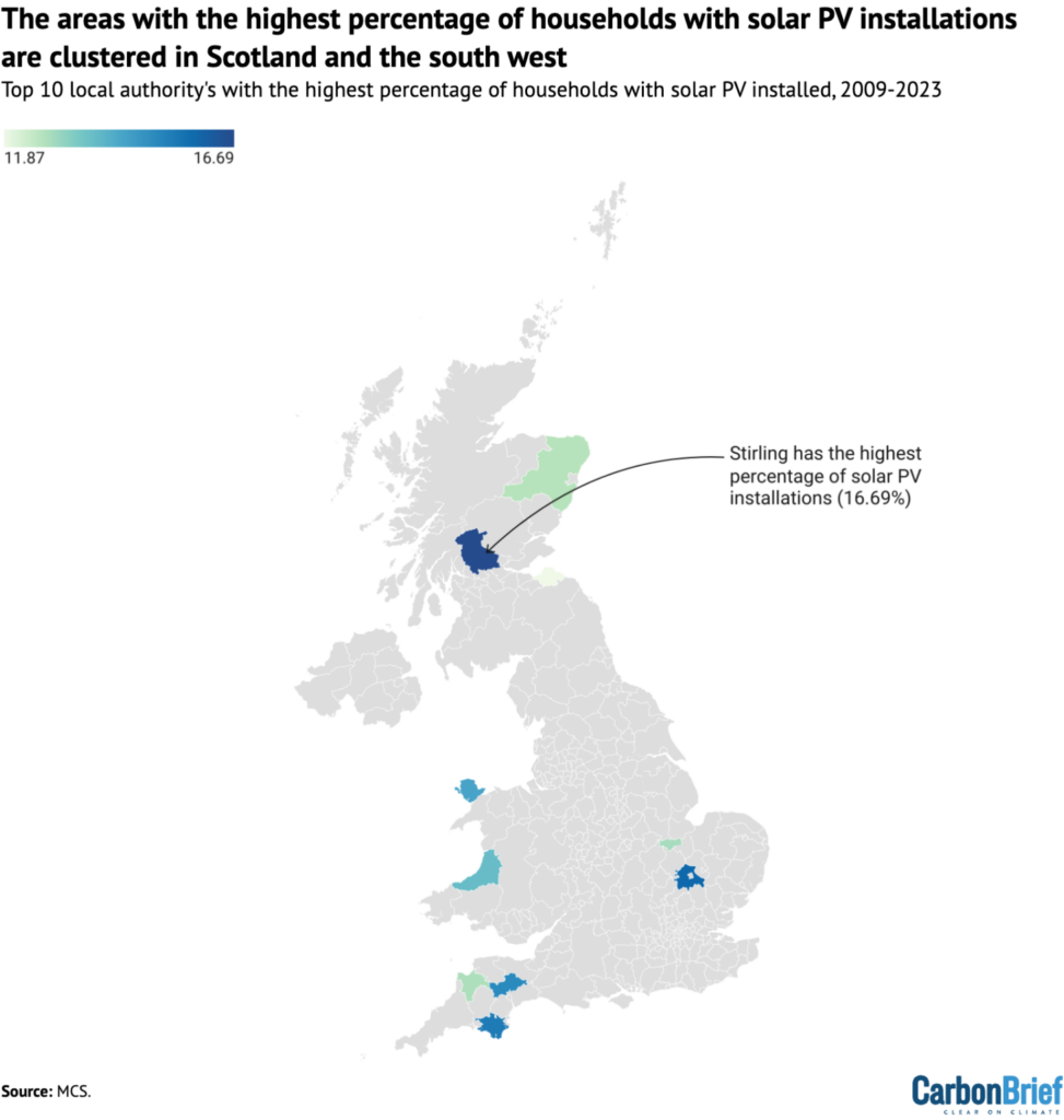 The 10 local authorities with the highest percentage of households with solar PV installations from 2009-2023, based on MCS data, showing installations clustered in Scotland, Wales and the southwest. Source: MCS. Map: Carbon Brief.