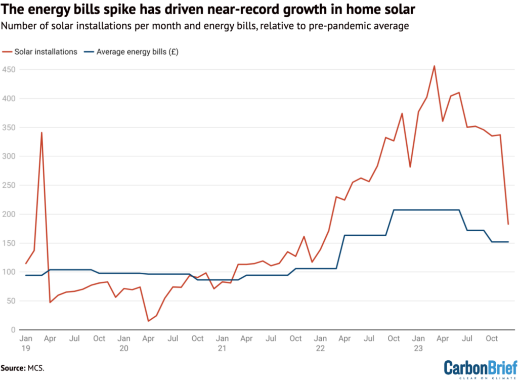 The increase in solar installations (red) in the UK based on MCS Dashboard data, and the average energy bills per month, relative to pre-pandemic average (blue) based on Ofgem’s default tariff price cap and the energy price guarantee. Source: MCS, Ofgem. Chart: Carbon Brief.