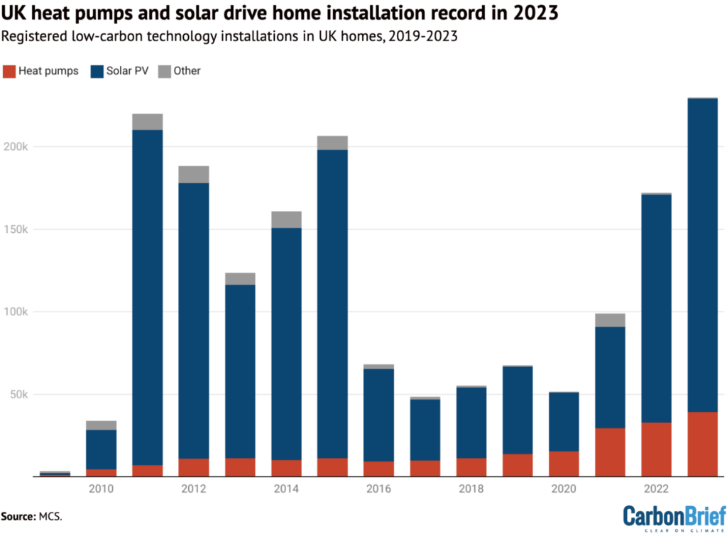 Below, Carbon Brief looks at MCS’s installation figures for 2023, picking out some of the most significant domestic developments.