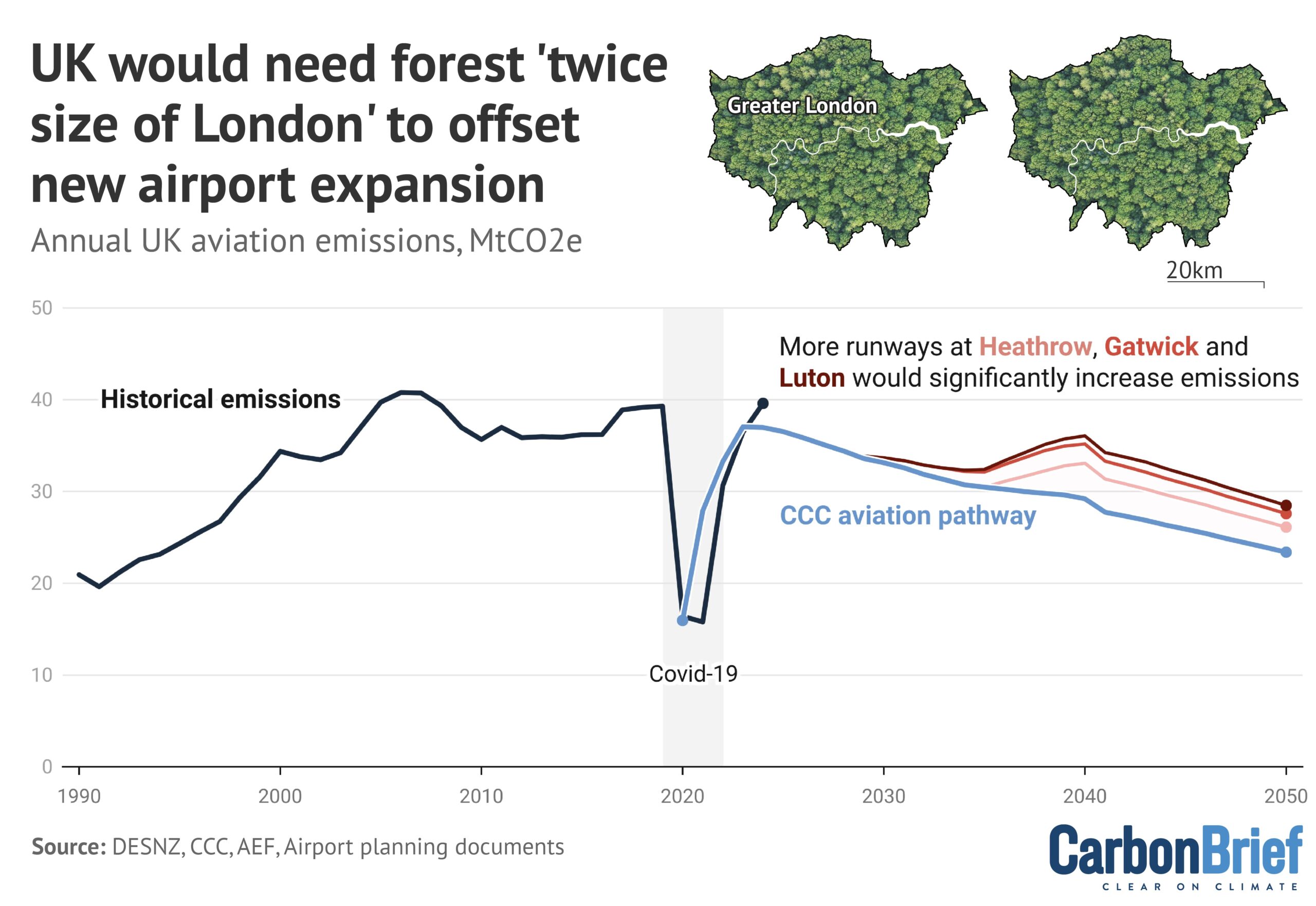 A forest twice the size of Greater London would need to be planted in the UK to cancel out the extra emissions from the expansion of Heathrow, Gatwick and Luton airports, Carbon Brief analysis reveals.