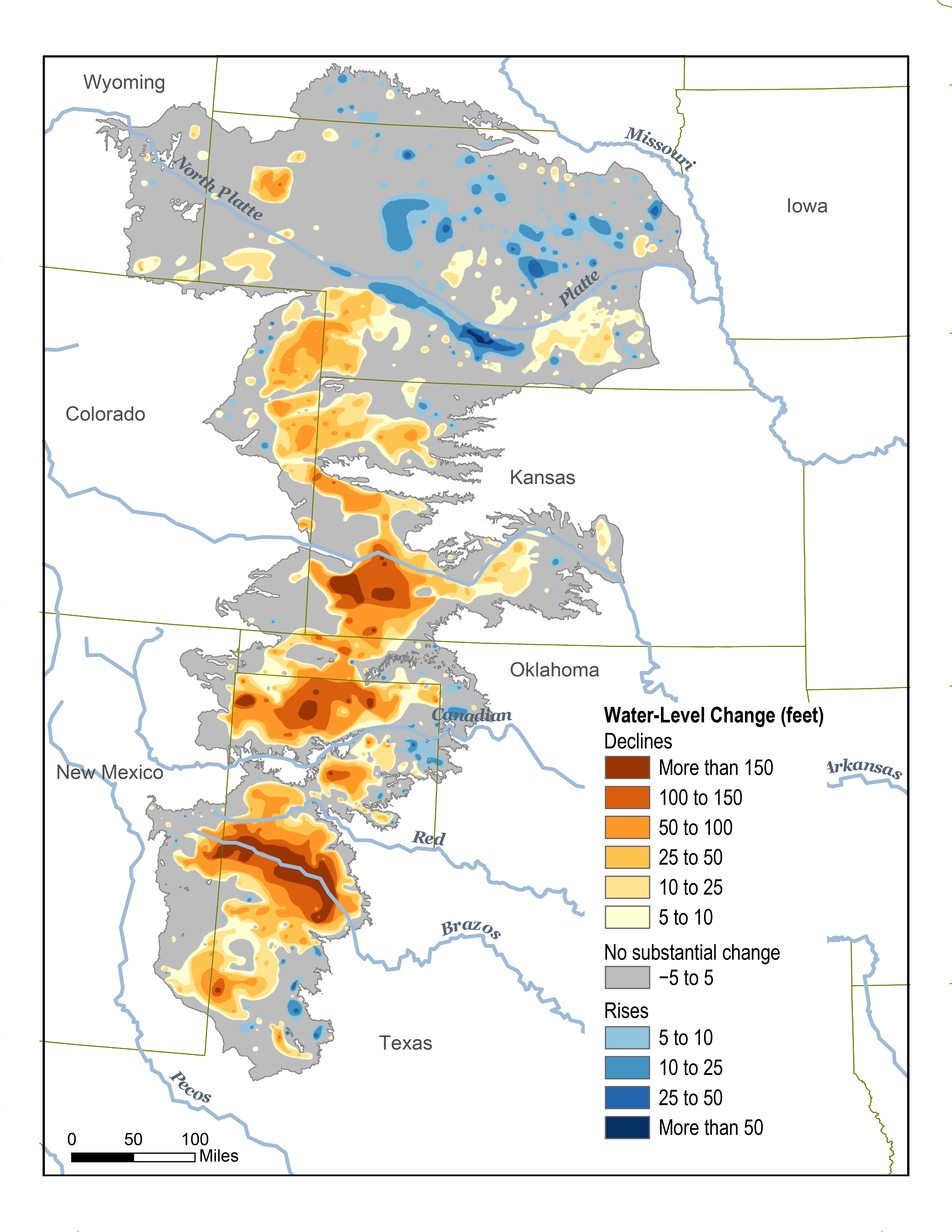 Changes in Ogallala water levels from before the aquifer was tapped in the early 20th century to 2015. Gray indicates no significant change. Water levels have risen in some areas, especially Nebraska, but are mostly in decline. NCA 2018