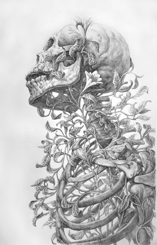 The original drawing standing over six feet tall, is an impressive and perfectly executed depiction of the entanglement of human life, and death, with nature. It powerfully symbolises the interwoven dependence of human life with nature, of how we are ourselves inextricably part of nature and symbiotic with it — and how we forget this at our peril.