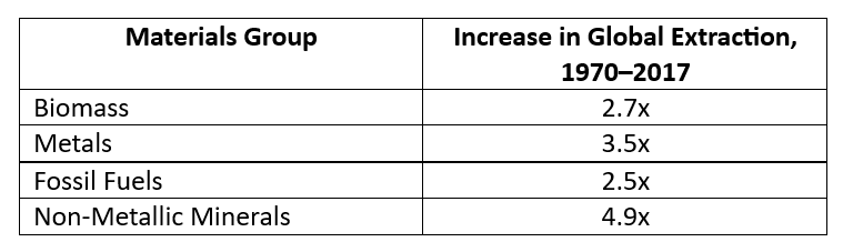 Indeed, humanity’s intensive use of materials explains much of the environmental damage generated by economies worldwide. UNEP’s International Resource Panel reports that natural resource extraction and processing in 2017 was responsible for 90 percent of global biodiversity loss, 90 percent of water stress, and 50 percent of global greenhouse gas emissions.