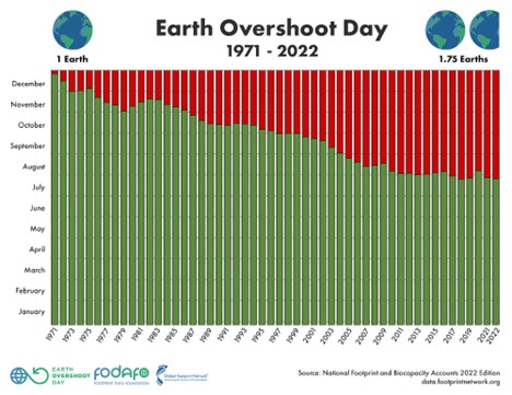 Since then, what GFN calls “Earth Overshoot Day”—the day when human consumption of renewable resources exceeds what Earth can produce for the year—has arrived ever earlier (the red portion in the graph). In 2022, Overshoot Day fell on July 28, meaning that for the remaining five months of 2022 humanity borrowed from nature to cover its consumption of renewable resources.
